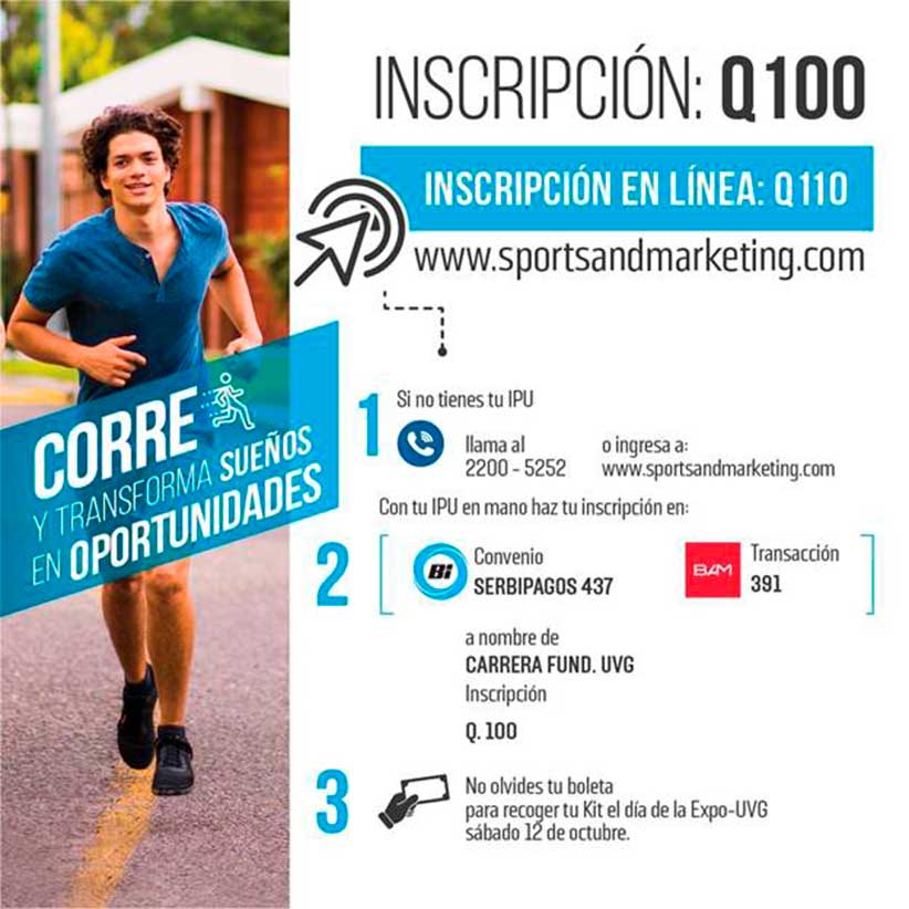 Si deseas inscribirte en línea, el costo es de Q110, y debes ingresar a Sports&Marketing con tu código IPU. Si deseas hacer el depósito directamente, el costo de la carrera es Q100 y lo puedes hacer en los bancos BAM (transacción 391) o Banco Industrial (convenio SerBIpagos 437). El 100% de la inscripción será destinado al fondo de becas de UVG.