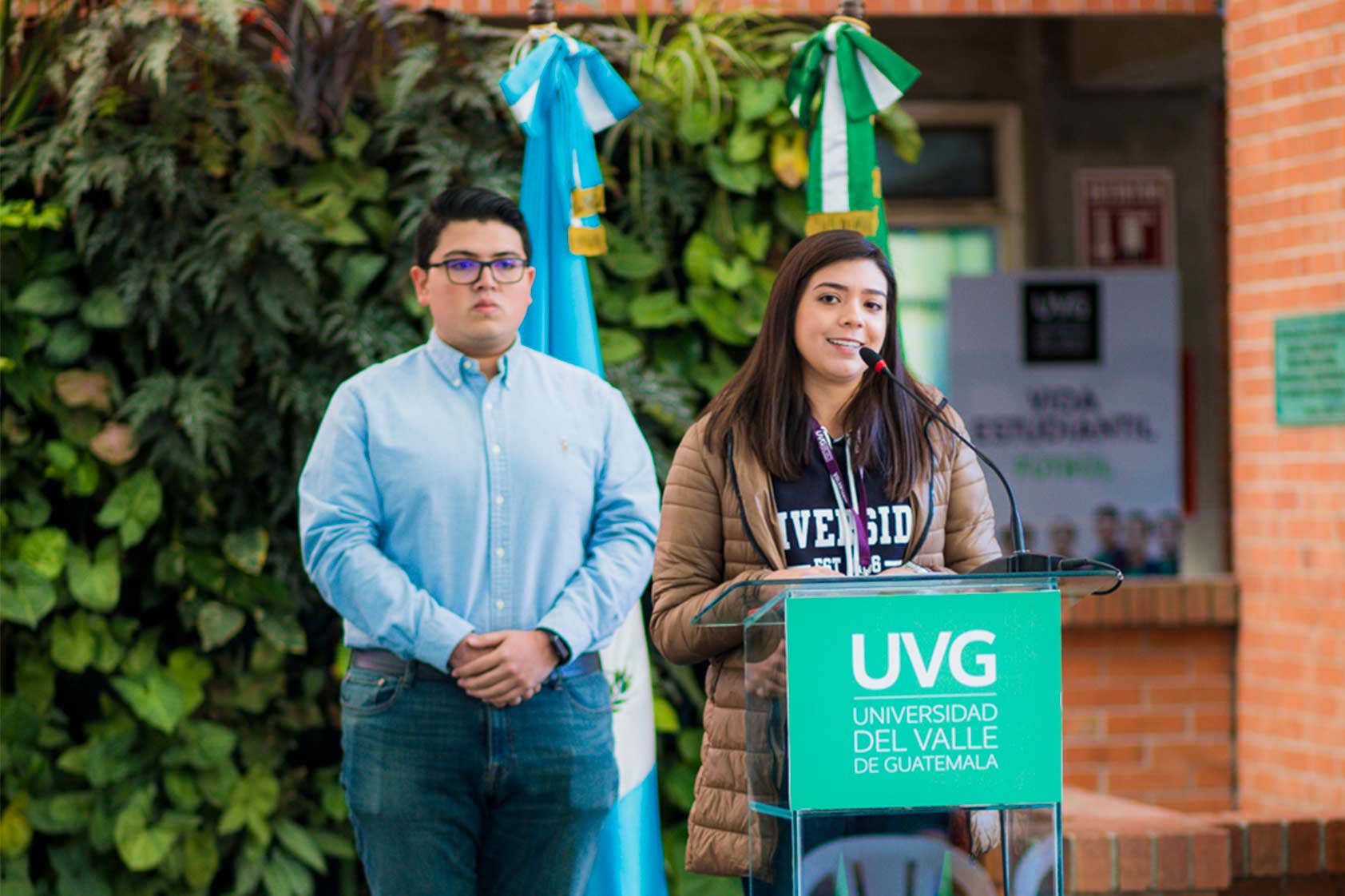Lucía Cruz y Sergio Polanco, presidente saliente y entrante de la Asociación de Estudiantes de UVG fueron los encargados de darles la bienvenida a los estudiantes de nuevo ingreso. Les compartieron sus experiencias y anécdotas que los llenaron de ilusiones y metas en para su vida universitaria.