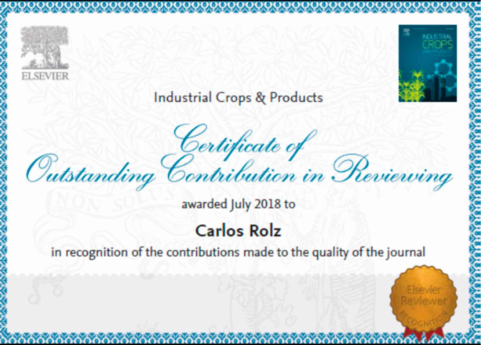 Recientemente recibió de la revista «Industrial Crops & Products» (Elsevier) un certificado que consigna sus contribuciones excepcionales en el trabajo como revisor.