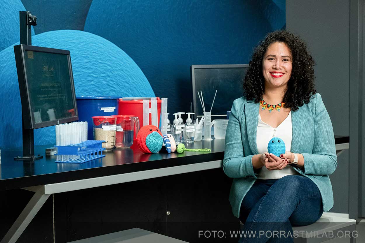 La Dra. Ana Porras es creadora del proyecto Tissue-Microbe Interactions Lab. Como experta en microbiología, encontró una manera ingeniosa de hacer que la ciencia fuera más accesible para el público: utilizó el arte del crochet para crear representaciones de microbios con el objetivo de captar la atención de las personas. Con la ayuda de voluntarios, pudo explicar conceptos complejos de microbiología, inicialmente en inglés y luego en español. Su trabajo ha llevado a la formación de clubes de ciencia en su país de origen, Colombia.