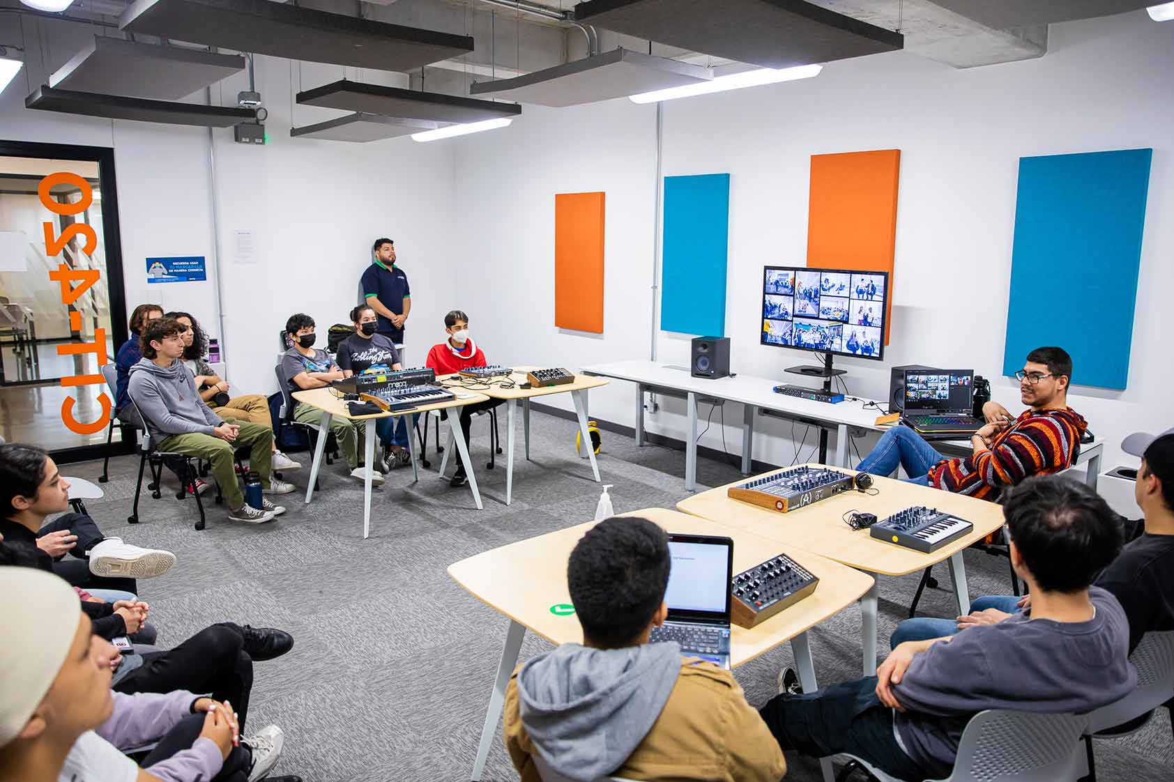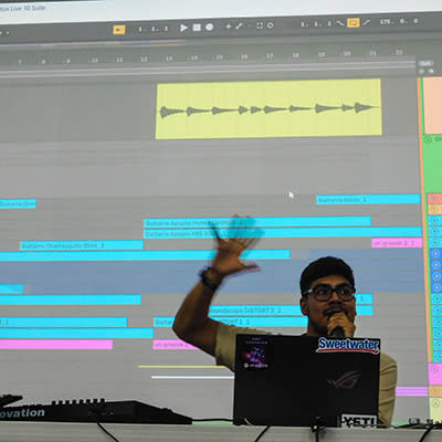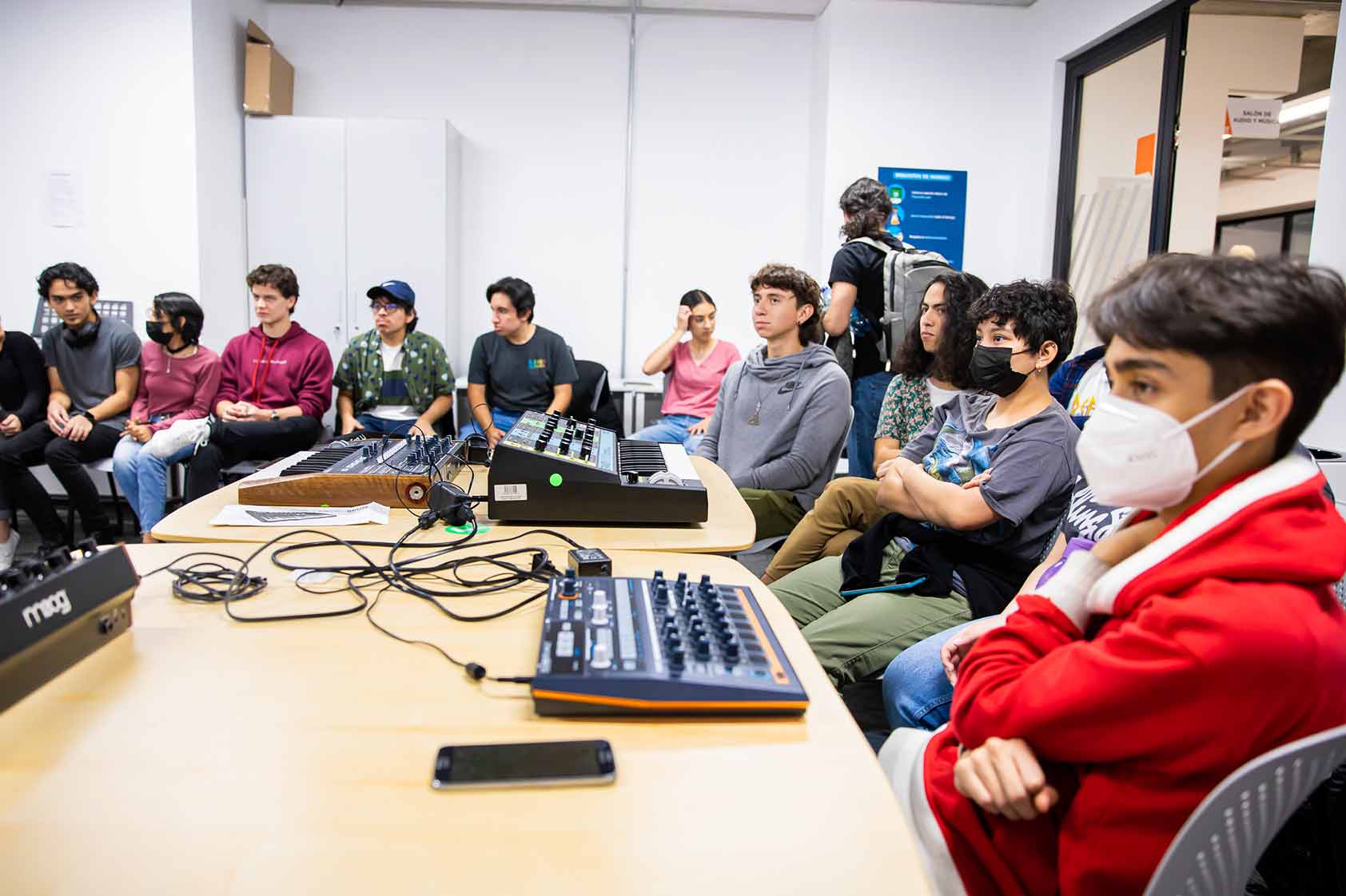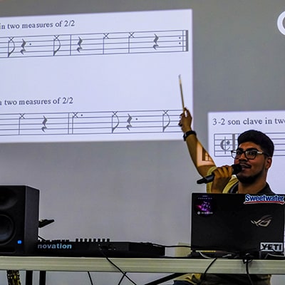 Como parte del taller, usó percusión para demostrar y tocar las diferentes claves afrocubanas y panameñas con estudiantes de la carrera de composición y producción musical. Durante el taller, los estudiantes tuvieron acceso exclusivo a la sesión en Ableton Live donde creé la canción. Además, pudieron ver todos los canales individuales con todas las capas que oyeron en la mezcla final y preguntar sobre procesamiento con efectos, técnicas de