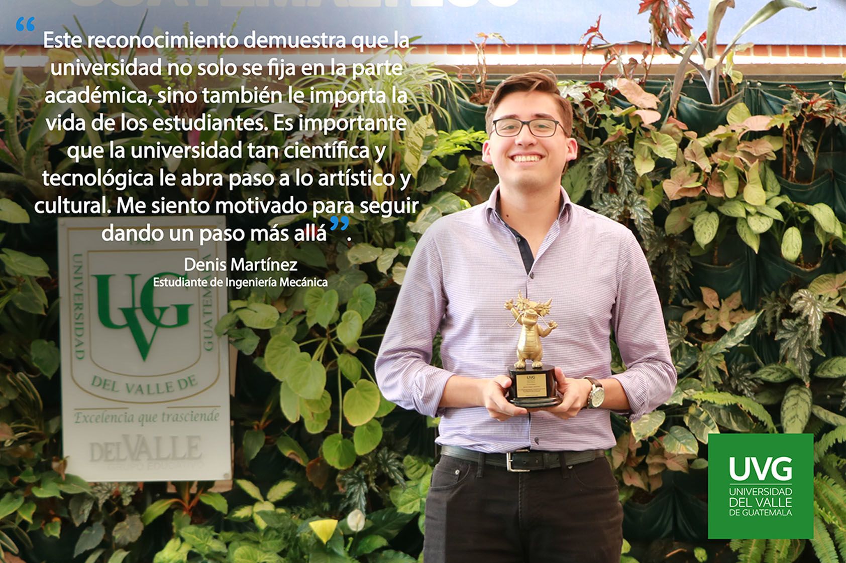 Denis Enrique Martínez, estudiante de la carrera de Ingeniería Mecánica, por su trayectoria en el Club de Teatro UVG, al que pertenece desde 2016. Fue presidente del mismo en 2018 y ha participado en diferentes obras.