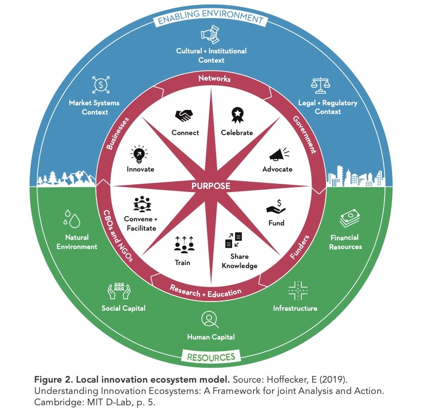 Según el modelo de un ecosistema de innovación local desarrollado por Hoffecker (2019) y representado visualmente en el modelo de arriba (Diagrama de un ecosistema de innovación local), un ecosistema local incorpora tres elementos: actores, recursos y un ambiente apto. El propósito del ecosistema es lo que le da sentido a la interacción y es el ente integrador. Esto se logra gracias al rol que juega cada actor, importante notar que en este modelo el rol tiende a verse sobre el tipo de institución. En la parte externa se encuentran los recursos y la aptitud del ambiente. Por un lado, los recursos están ubicados en la parte inferior del diagrama y son aquellos recursos de origen natural o creados por el humano que son esenciales para el funcionamiento del ecosistema. Por otro lado, un ambiente apto es un factor que involucra los elementos que puedan influir o afectar el funcionamiento del ecosistema.