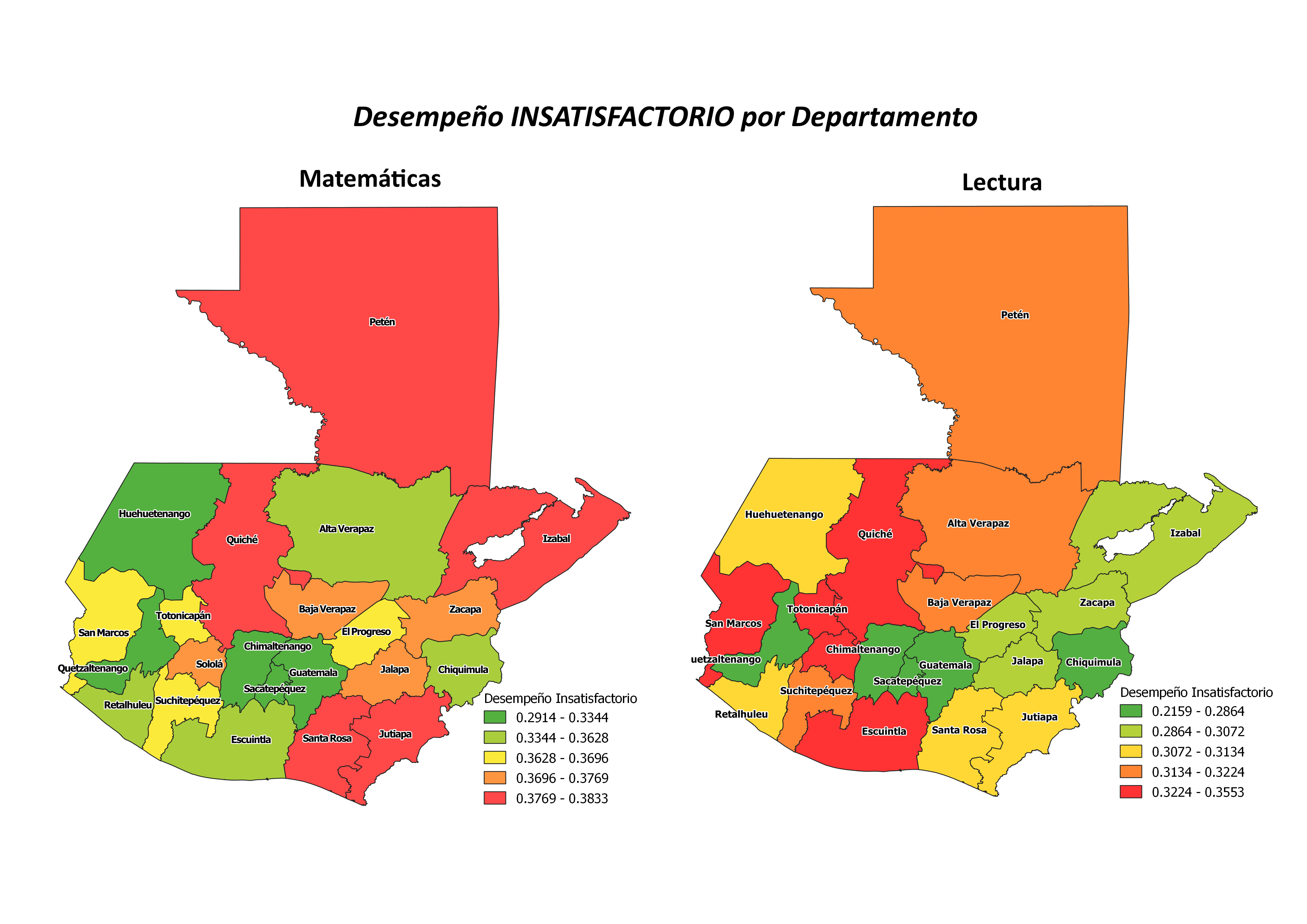 Los departamentos con las notas más bajas en Matemática son Petén, Quiché, Izabal, Santa Rosa y Jutiapa. Mientras que, para Lectura, fueron Quiché, San Marcos, Totonicapán, Sololá y Escuintla.
