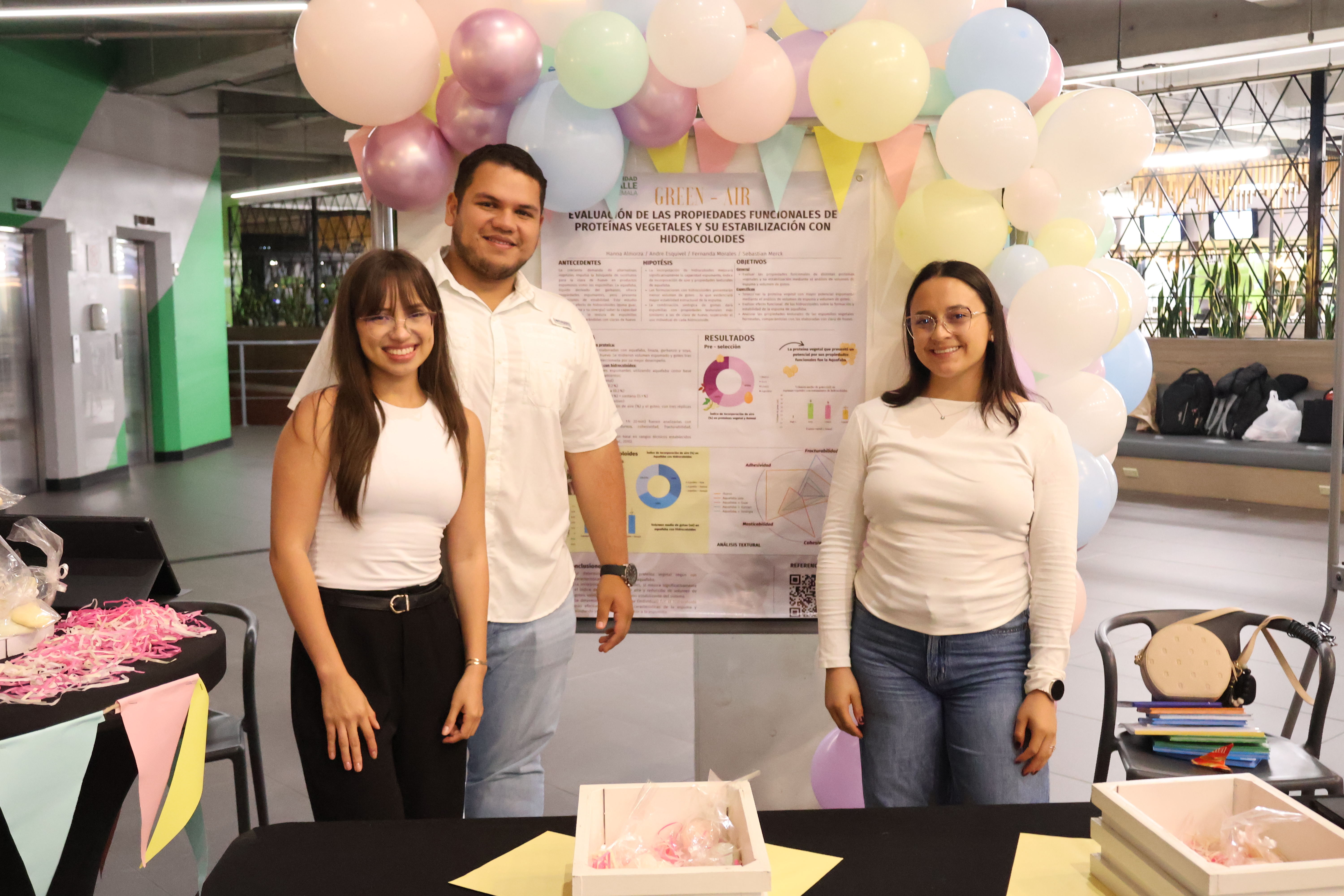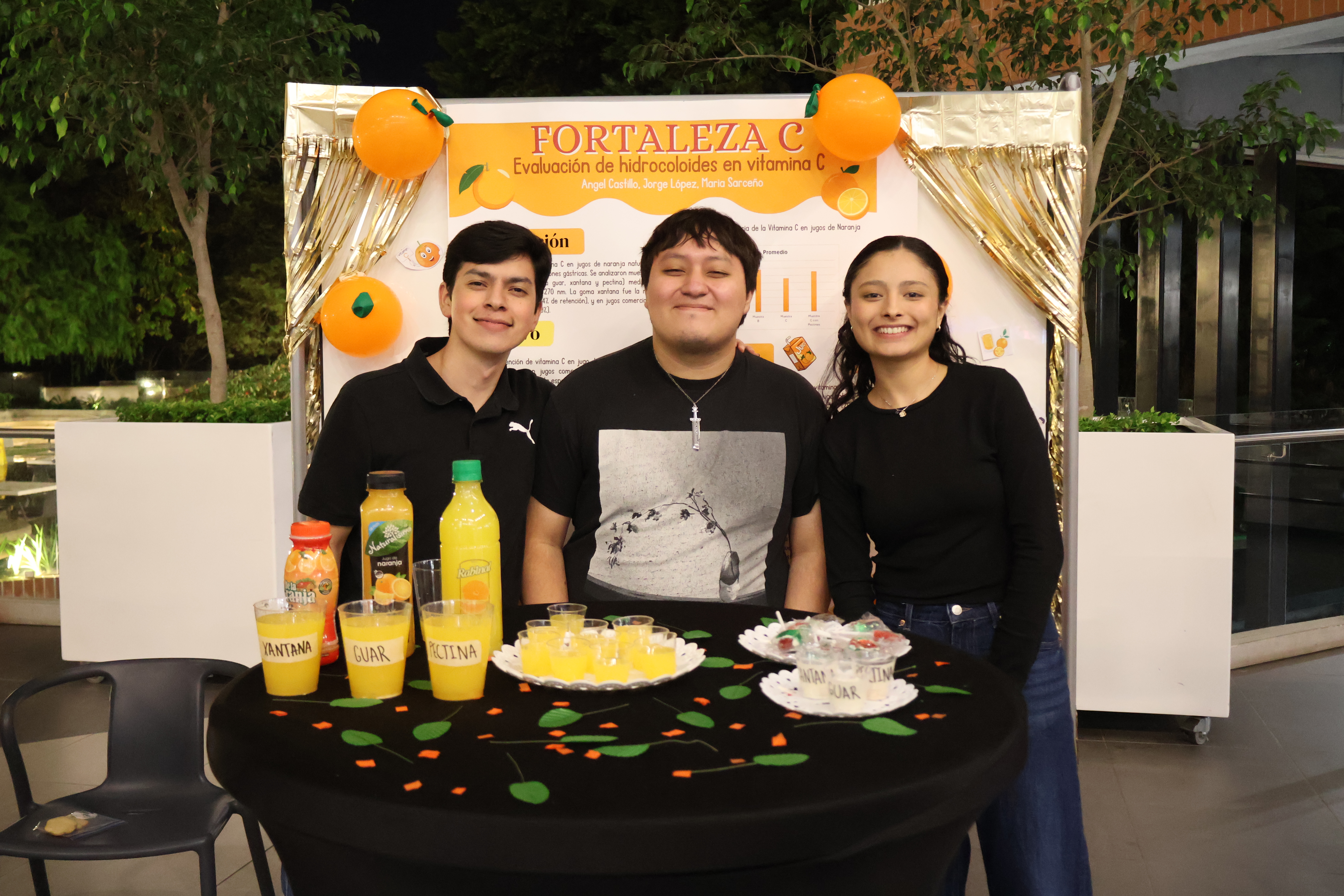 GreenAir, presentado por Fernanda Morales, Sebastián Merck, Hanna Almorza y André Esquivel, obtuvo el segundo lugar. Este equipo evaluó las propiedades funcionales de las proteínas vegetales en la formación de espumas y la estabilidad que ofrecen hidrocoloides como la goma guar y la goma xantana. Mientras que el tercer lugar lo alcanzó Fortaleza C, de Ángel Castillo, Jorge López y María Alejandra Sarceño. Su proyecto consistió en evaluar cómo los hidrocoloides contribuyen a la retención de vitamina C en jugo de naranja, mediante simulaciones gástricas y análisis espectrofotométricos.