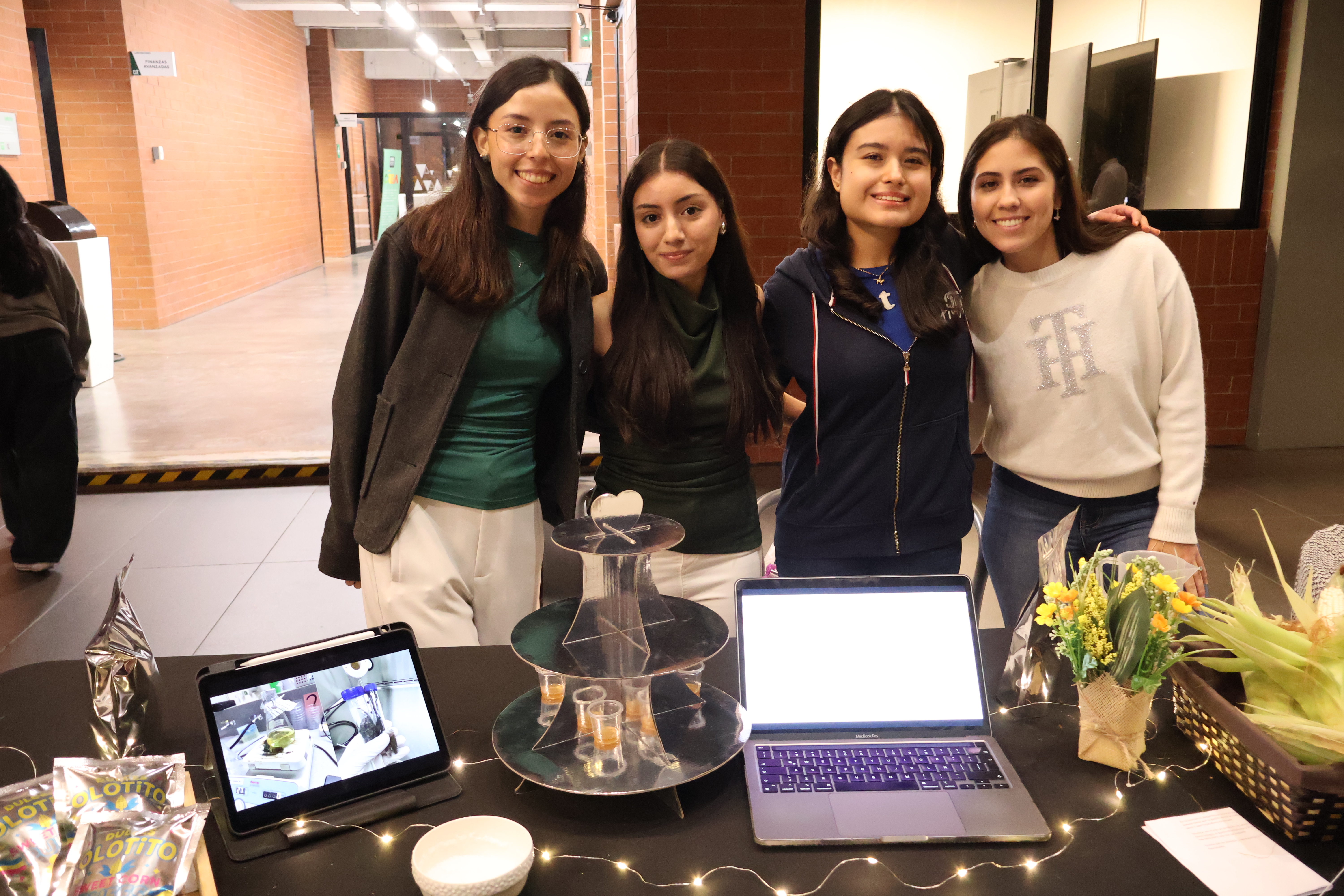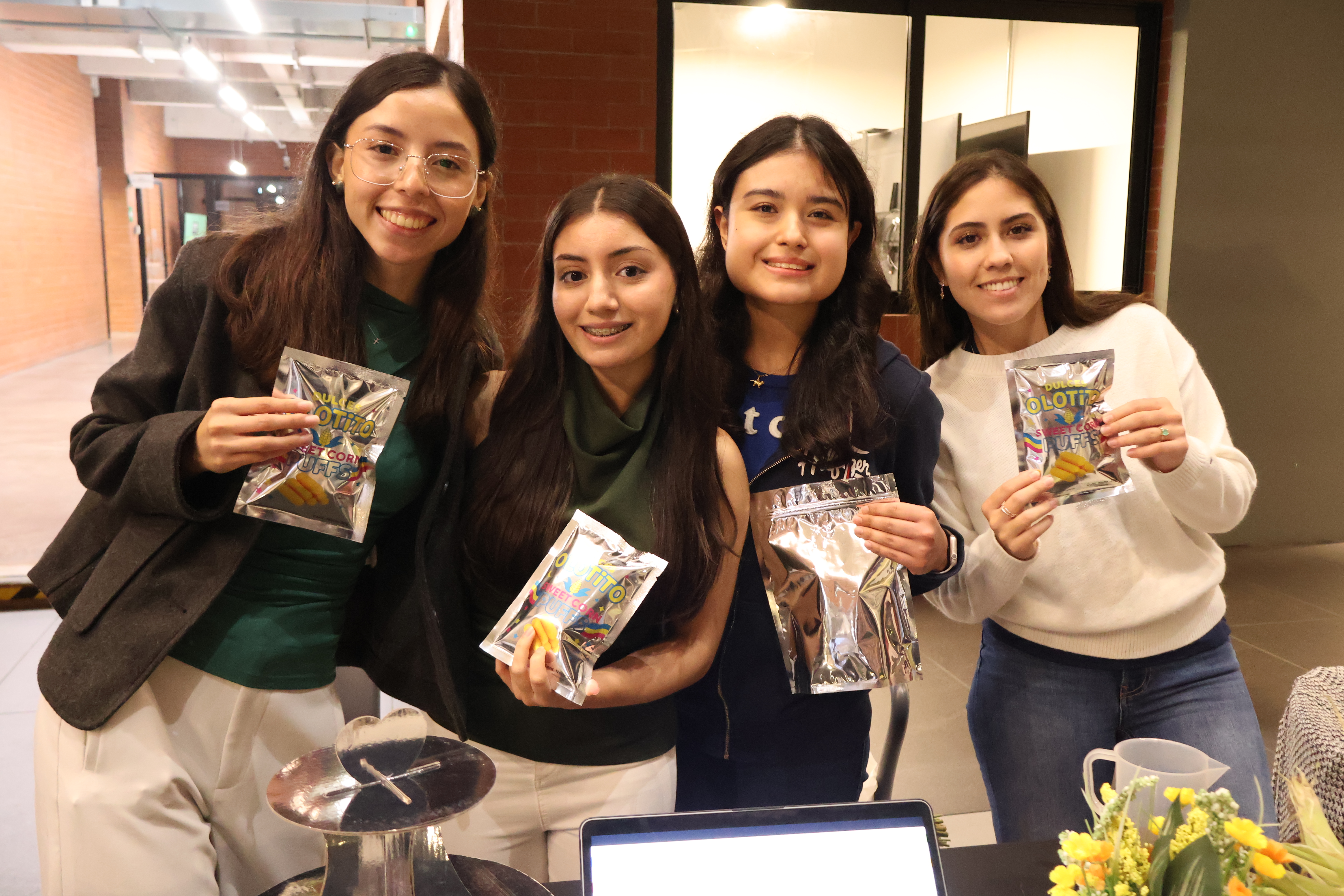 Los estudiantes de cuarto año, del curso Ingredientes Tecnológicos en la Industria de Alimentos también presentaron productos diferentes. El equipo de Olotito Sweet Corn Puffs obtuvo el primer lugar con un snack de maíz y tusa extruidos, cubiertos con un jarabe a base de xilitol o alcohol de azúcar extraído del elote. Issys Álvarez, Sonia Dávila, Andrea Cabrera y Johana Sierra destacaron por aplicar principios de economía circular.