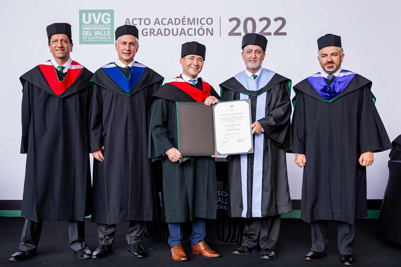 La distinción de Doctor Honoris Causa de la UVG se confiere a personas que hayan contribuido al desarrollo de la ciencias, tecnología, humanidades o artes. Esta distinción se otorga a personas nacionales o extranjeras que no estén actualmente incorporadas laboralmente a UVG.