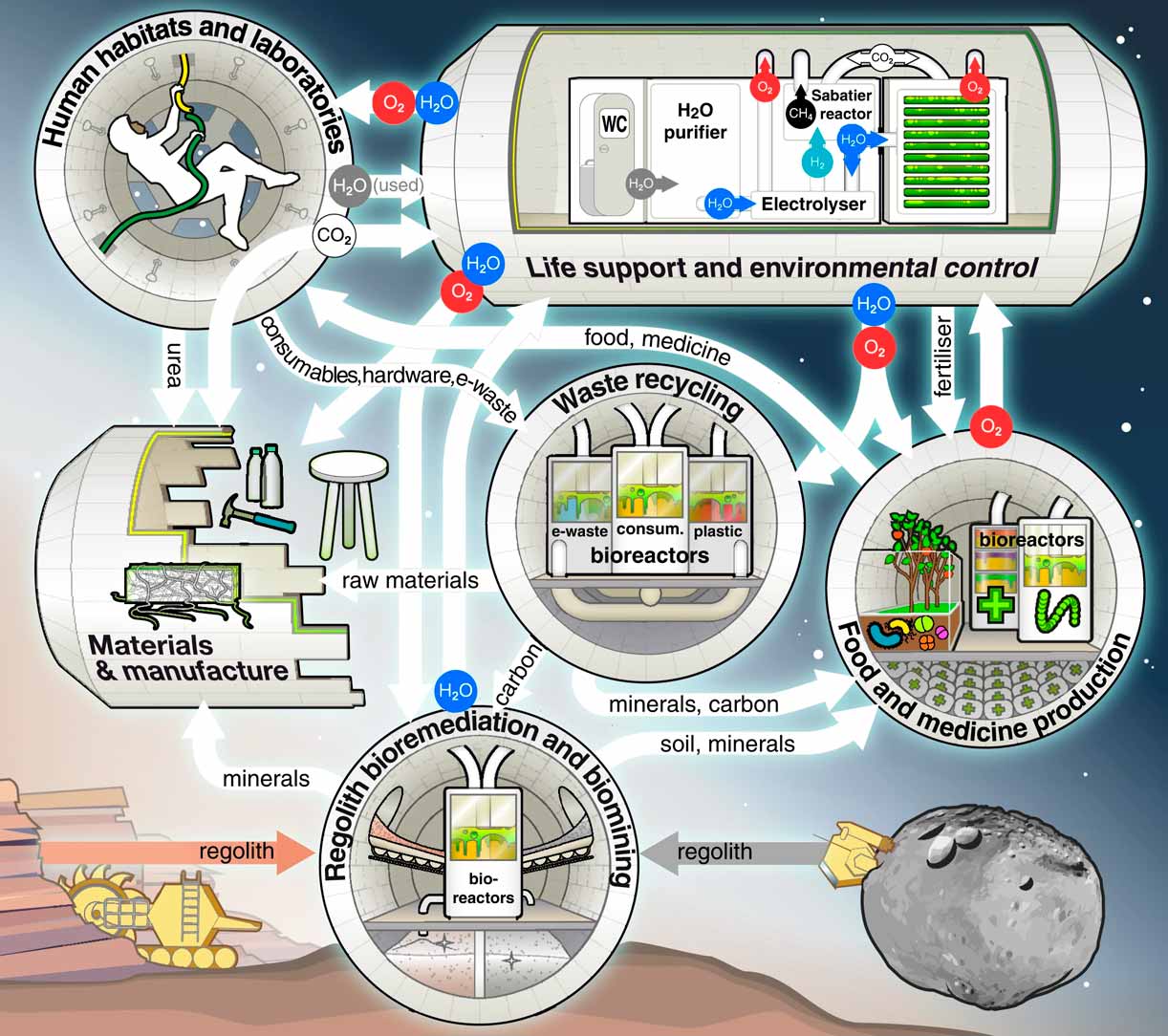 Los microorganismos están incluidos en todos los compartimentos funcionales, incluidos los “hábitats y laboratorios humanos” (es decir, el microbioma humano) y aquellos que también requieren reactores mecanoquímicos. La carga y el reciclaje de diferentes flujos de recursos y el cierre del ciclo se indican mediante flechas blancas, respaldadas por la utilización de recursos in situ (flechas de colores), según corresponda.