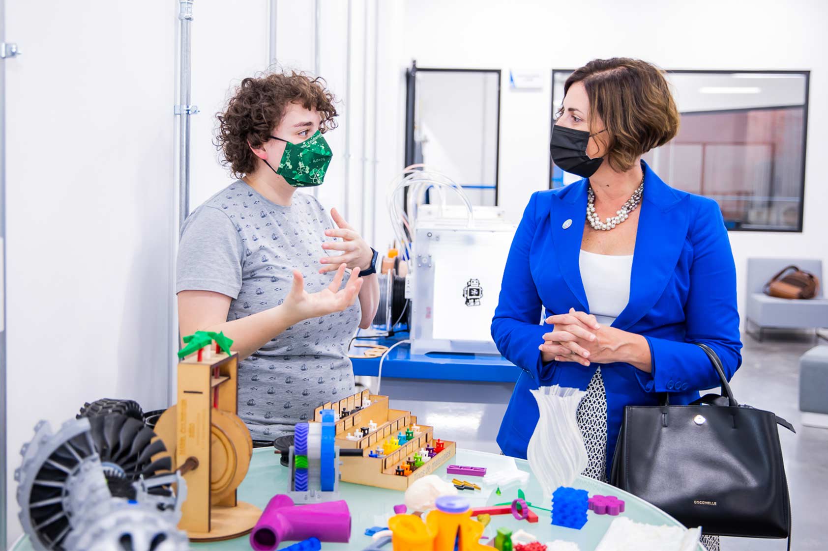 Beth Bechdol hizo un tour por el Centro de Innovación y Tecnología (CIT) y conoció más acerca de los proyectos que estudiantes e investigadores trabajan en el makerspace D-Hive.