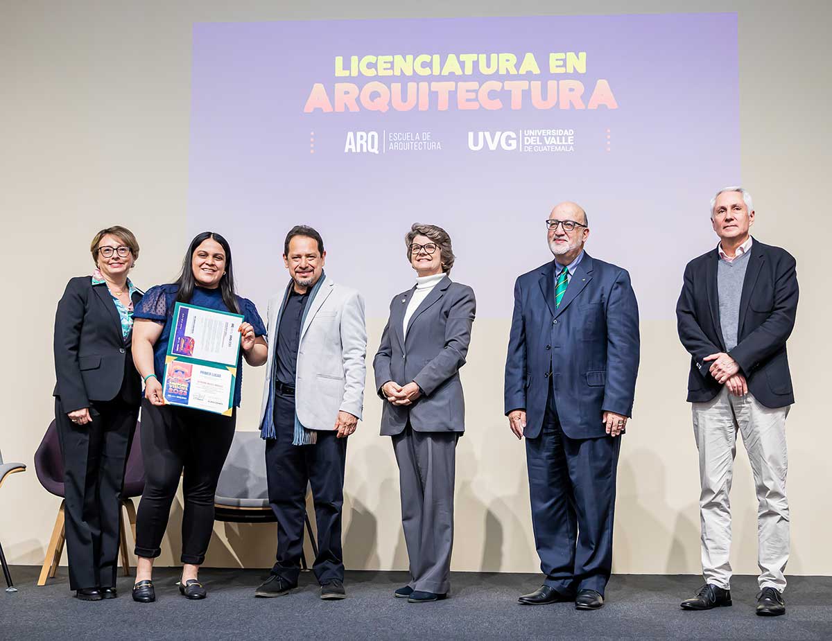 Catherine Michelle Morales, ganadora de la categoría Estudiantes, con autoridades de UVG.