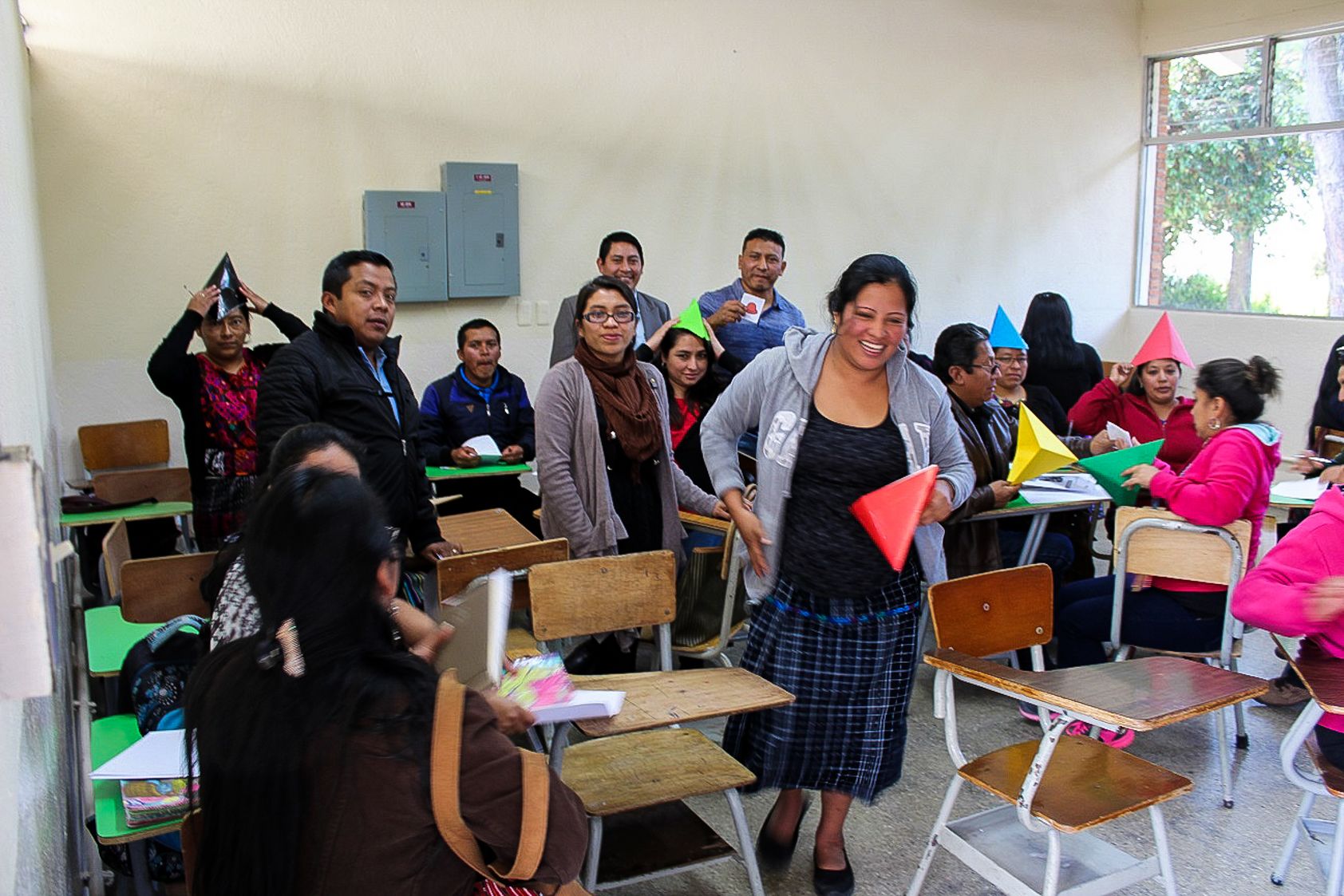 Los docentes armaron sus propios sombreros de colores para realizar la estrategia de seis sombreros para pensar de Edward De Bono. Cada sombrero es una manera diferente de abordar un conflicto o tema, por ejemplo, el sombrero amarillo busca lo positivo y el blanco busca hechos o datos relacionados.