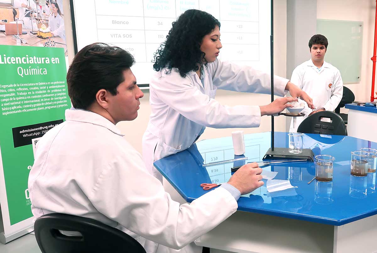 Después de realizar pruebas en distintos hogares de la ciudad, Camila Rivera, Mario Flores y Hugo Escobar, estudiantes de la Licenciatura en Química, presentaron el prototipo del sólido reactivo para purificar y sedimentar contaminantes del agua. En la presentación, los estudiantes mostraron cómo separaba las partículas nocivas para la salud y se procedió a filtrar el agua para su consumo humano.