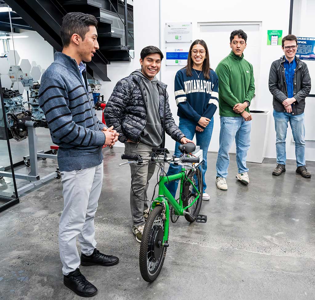 Adriana de Paz, de Ingeniería Química; Emanuel Sandoval, de Ingeniería Mecánica; Estuardo Castillo, de Ingeniería Electrónica, y Andrée Herrarte, de Ingeniería Biomédica, presentaron una bicicleta adaptada con el Electropedal. El dispositivo busca generar energía sostenible por medio del movimiento de una bicicleta.