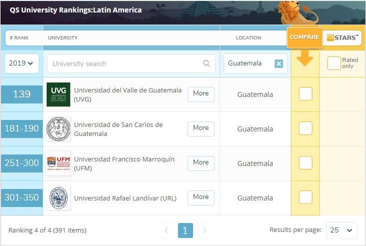 La Universidad del Valle de Guatemala ocupa el primer lugar del ranking en Guatemala y además somos el primer lugar de las universidades privadas de Centro América y Panamá; ambos puestos dentro del Ranking QS publicado el 30 de octubre de 2018.